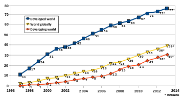 1. With December underway and 2015 just around the corner we are nearly halfway through the fiscal year of 2015. Yet even as we move forward in time history still heavily defines us. On this day, forty five years ago, in 1969 the four-node ARPANET was established (four computer/routers: UCLA, Stanford Research Institute, UC Santa Barbara, & University of Utah), paving the way for the internet without which it is hard to imagine today’s world. The WorldWideWeb was the name of the first web browser (a software application for retrieving, presenting, & navigating information in the form of uniform resource identifiers – URI/URLs) that Tim Berners-Lee created in 1990 using a set of rules to govern the transfer of information between computers. These rules were called the hypertext transfer protocol (HTTP). The browser of Berners-Lee was later renamed Nexus. Soon better competing products appeared – Erwise, Mosaic, Netscape Navigator, Microsoft Internet Explorer, Firefox, Apple Safari, and Google Chrome. Take your pick and enter today’s World Wide Web, our latest information revolution. This so-called digital revolution followed the industrial revolution, which in turn followed Gutenberg’s earlier information revolution of commercial printing. The web is now the digital revolution playing ground with data ubiquity, human connectivity, and computer power translating into “the internet of everything.” The promise of equal access to information should give all people a fair shot at the basic aspirations of civilization – a decent self-determined life affording liberty and the pursuit of happiness, although I don’t see this happening with great speed around the world. The conditions of good government, law & order, food security, health care, education, and personal safety are necessary to ensure all people their due decent life. As physicians, urologists, teachers, nurses, PAs, clerks, administrative staff, and scientists we do our part for mankind’s wellbeing in terms of healthcare, but our attention as citizens to government, justice, and poverty is no less compelling. The internet offers unprecedented opportunity to understand and impact these crucial issues of citizenship. The internet also allows malevolent souls who might be oceans and continents away access to your bank account, personal information, and home thermostat much like an evil Santa Claus entering your life through the chimney of your internet connection. [Diagram – nearly everybody uses the internet: internet users per 100 people. Source International Telecommunications Union]
