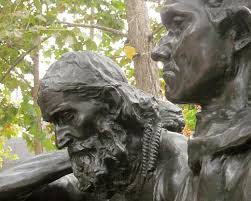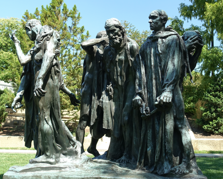 [Burghers of Calais, Smithsonian Museum/Hirshhorn Sculpture Gardens on a bright sunny day in Washington, DC, August, 2014. Curiously, French law allegedly decrees that no more than 12 casts of any Rodin work can be made. The original version of the Burghers in Calais was cast in 1895. The Smithsonian/Hirshhorn sculpture was cast in 1943 and you can find other casts near the Houses of Parliament in London, the Rodin Museum in Philadelphia, The Norton Simon Museum in Pasadena, the Metropolitan in NYC, the Kunstmuseum in Basel, and others in Copenhagen, Belgium, Paris, Tokyo, and Seoul. Stanford has sculptures of the individual figures, no doubt skirting the letter of the French law.]