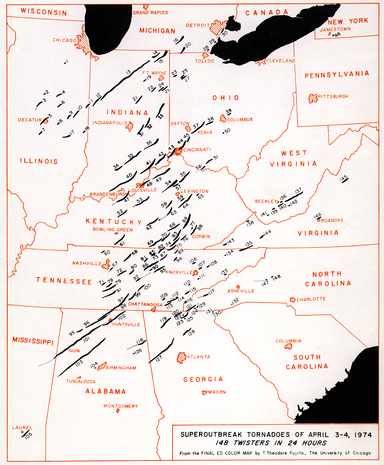 In 1974 North America’s biggest tornado outbreak in recorded history occurred on this day [pictured above]. That Super Outbreak lasted 18 hours with 148 confirmed tornados and a death toll of 315, with nearly 5,500 injured. This was surpassed in 2011 April 25-28 with an outbreak over 3 days and 7 hours, 355 confirmed tornados, and 324 dead. Whether or not anthropogenic climate change is causing more extreme meteorological events will take some time to know, but there is no doubt that extreme weather conditions will continue to wreck havoc.