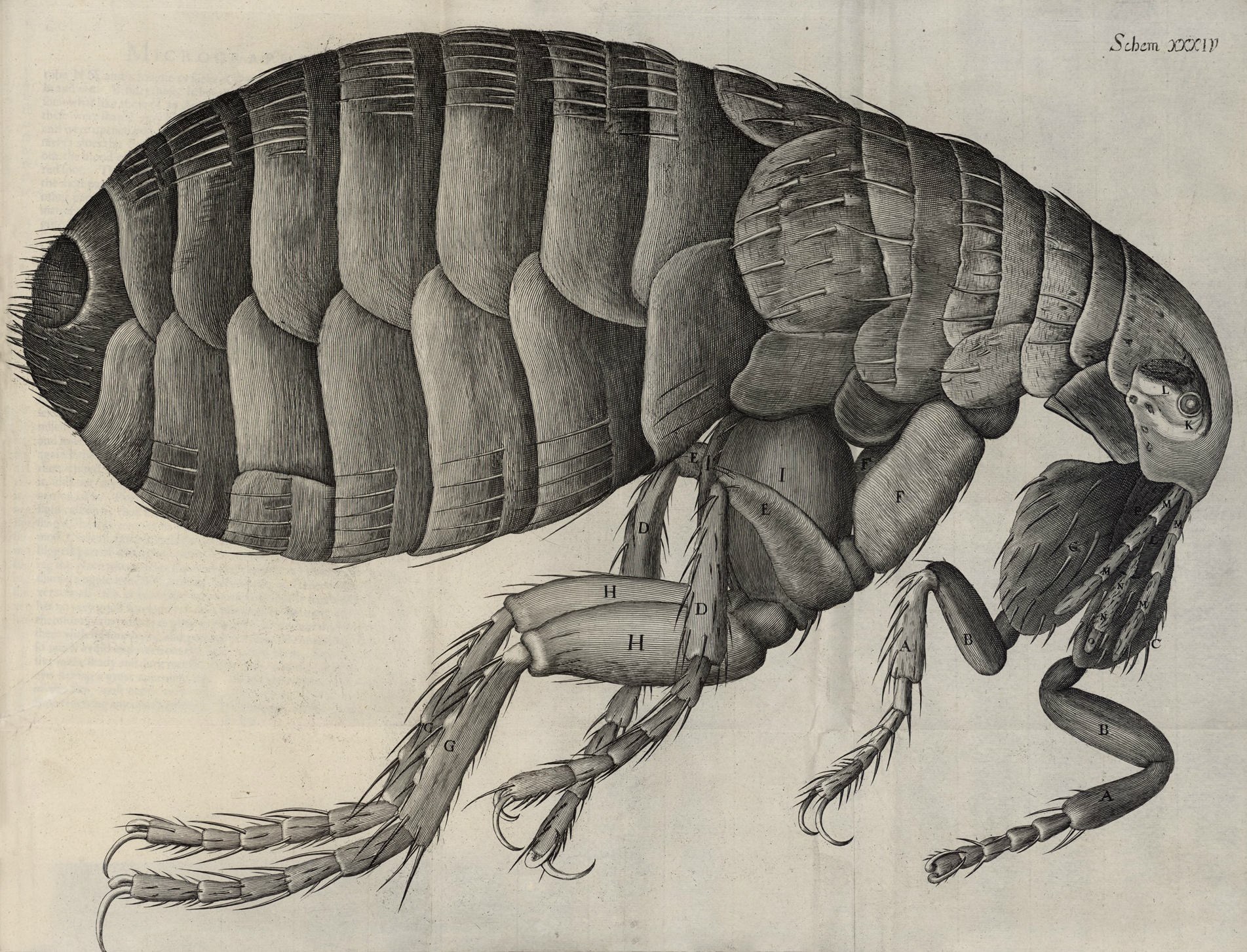 Five. We also individually carry forward into 2016 a boatload of creatures, although perhaps less than those young soldiers hosted in Vietnam’s jungles. We carry viruses, bacteria, yeast, mites, and even fleas. Fleas (Order: Siphonaptera) have been around much longer than we mammals and have adapted well. Over 2,000 species of these wingless insects (1.8-3.3 mm long) live off blood of mammals and birds (hematophagy), but for all their nuisance to mankind we never knew what fleas really looked like until January, 1665 when Robert Hooke published a drawing in his book Micrographia, based on observations with a microscope specially built for him. Hooke was an extraordinary polymath whose work extended from the anchor escape mechanism to the biologic world. In Micrographia he was the first to use the term cell in the biologic sense (as he noted in microscopic examination of cork) for its resemblance to honeycomb cells or to monastery rooms of monks.
