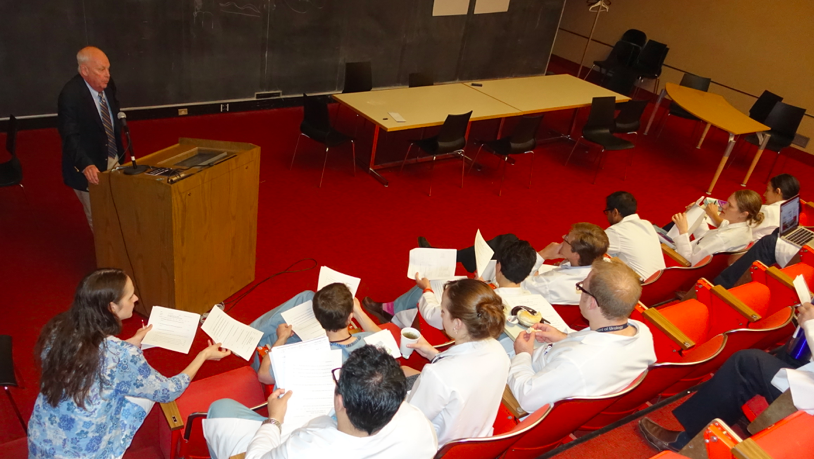The point to make is that the conversation of error in health care is essential. The practice of medicine is, indeed, a practice and things that don’t turn out as intended need to be investigated to improve quality of practice. Charles Bosk’s 1979 book, Forgive and Remember, is a classic starting point. You can get a good summary of it in Robin Williamson’s review of its 2003 edition [J. Royal Society of Medicine. 2004 Mar; 97(3): 147-148]. While surgical fields have a long history of tough treatment of trainees, surgical training today (GME) is far less recriminating when errors are the result of earnest effort. [Below: Ed McGuire lecturing as emeritus professor to residents last year.]