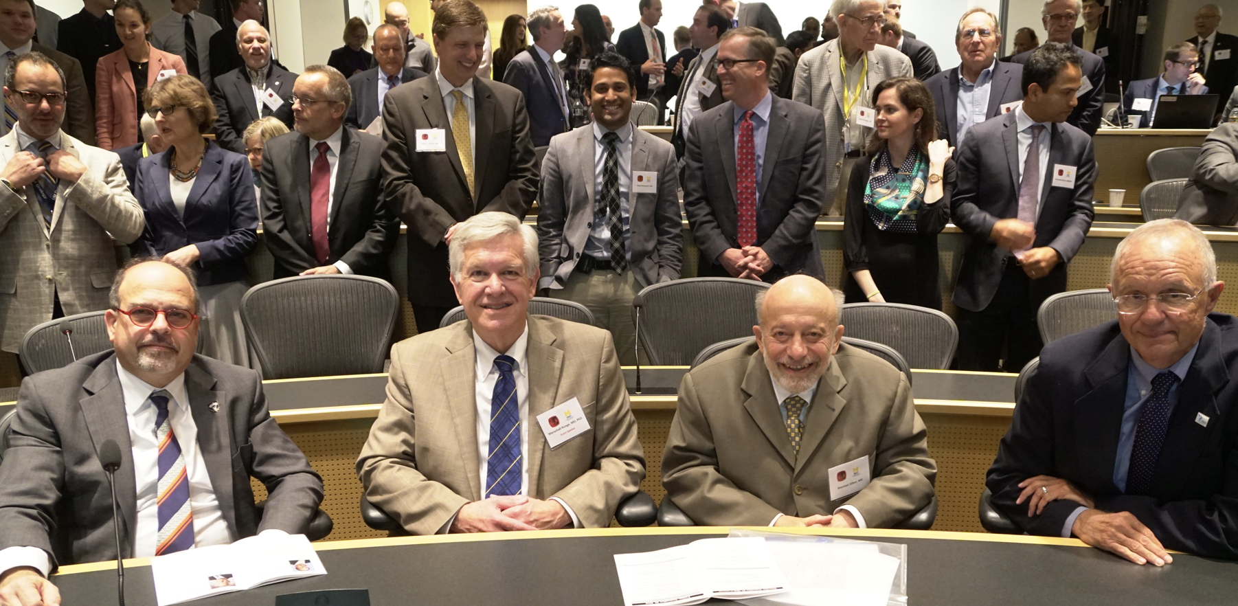 [Above: Freddie Hamdy presents results of prostate cancer trial. Below: Freddie Hamdy, Marschall Runge, Sherman Silber, Jim Monte & Nesbit attendees]