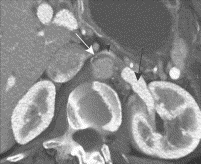 Distended left renal vein (black arrow) compressed between