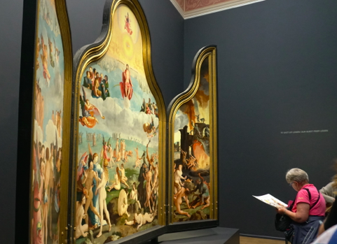 Bosch also painted a strange work called The Wayfarer, mentioned here last month for its stranguria depiction. The world of Hieronymus Bosch around 1500 was probably a pretty grim place, although not devoid of earthly delights, as he imagined in his triptych. A later triptych, The Last Judgement (c. 1527) by another Dutch artist Lucas van Leyden, depicts the actual day of judgment in the middle panel flanked by heaven on the left on hell on the right.