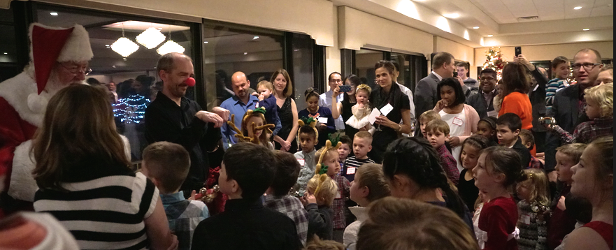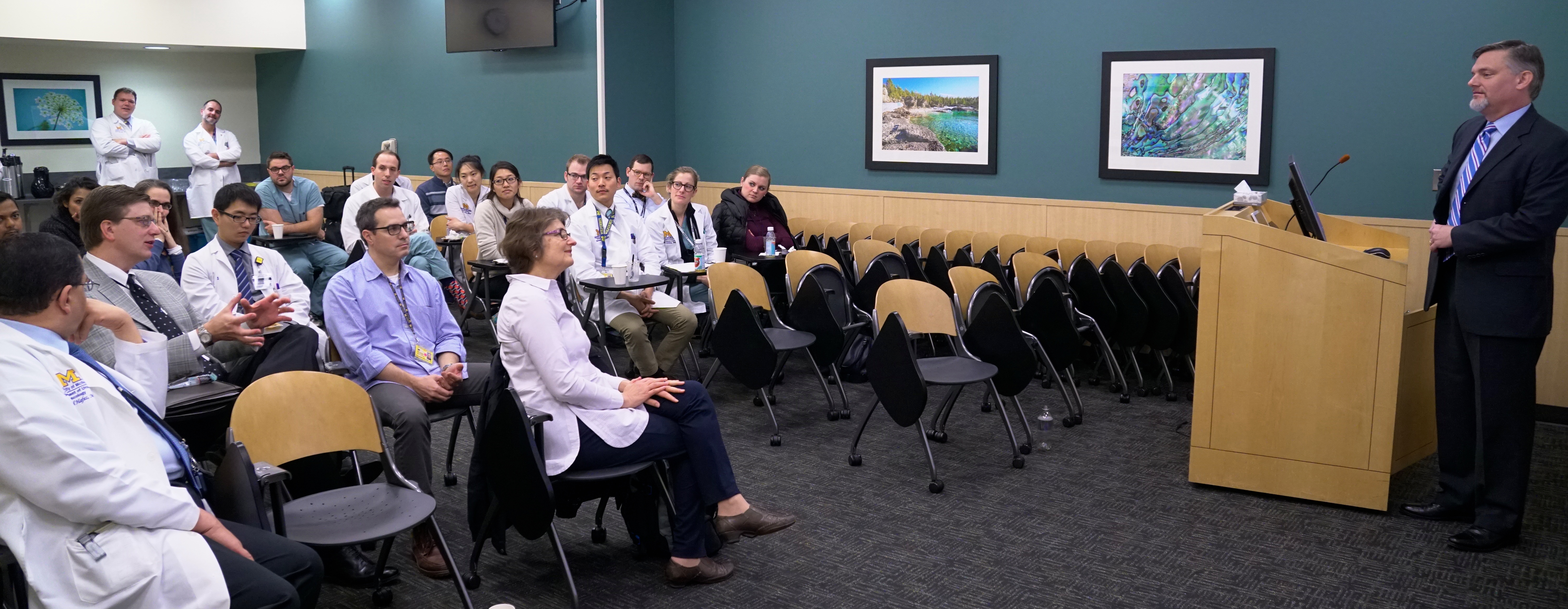 Our holiday party at Fox Hills entertained over 350 people with the expected surprise of Santa who had gifts for all the children (above). Pat Soter, her husband Jim, as well as Sandy and Bob Heskett, did the heavy lifting for this event and we thank them. Pat’s retirement leaves a major challenge filling her shoes. A faculty evening meeting (below) discussed residents progress, urology divisions, strategic planning, and John Stoffel’s stint as Acting Chair.