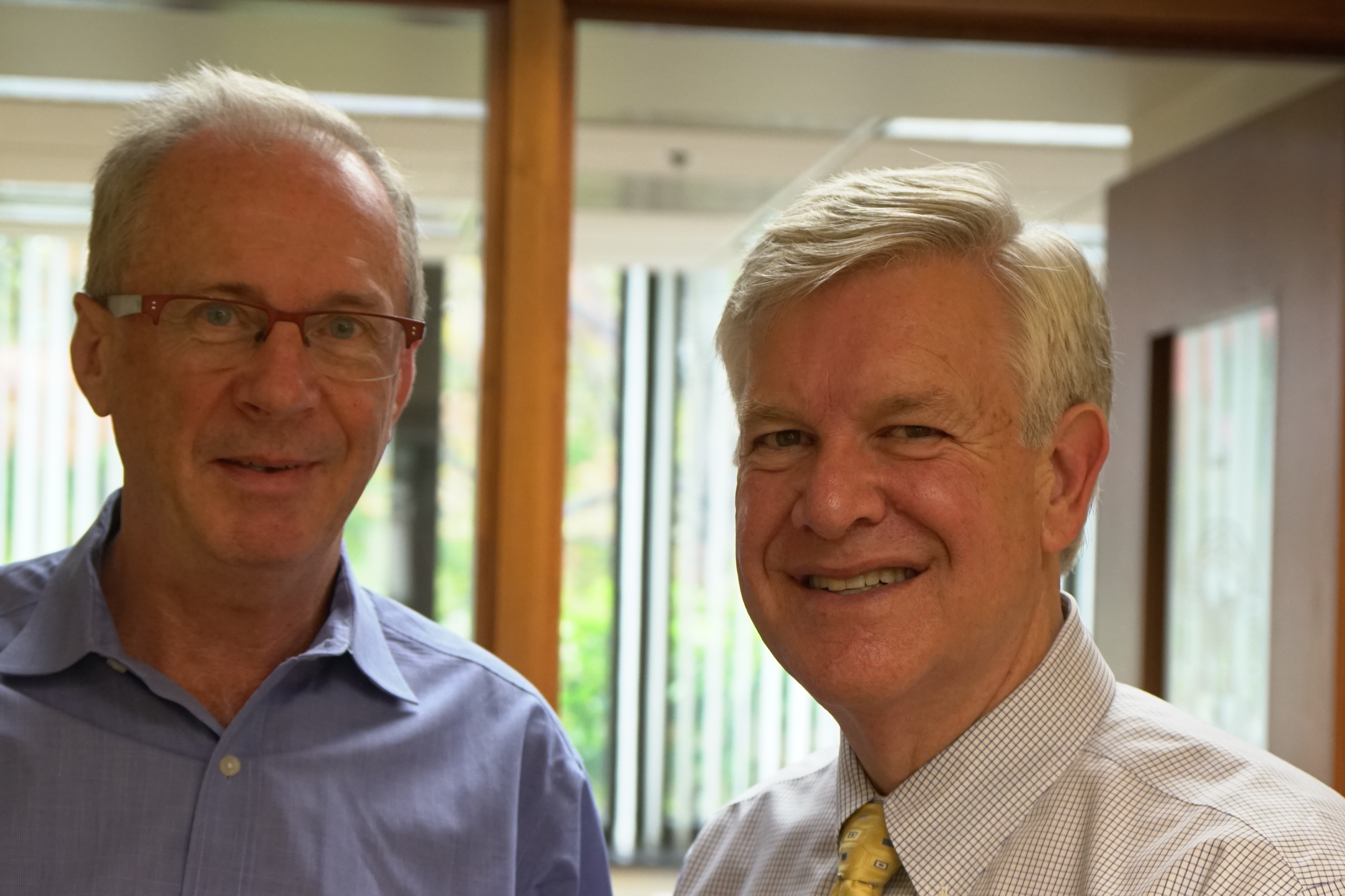 Inclusion of a hospital within the Medical School, extended medical education from classrooms to bedsides, a first step in building the UM Health System. Clinical and investigational laboratories later brought science into medical education and created new opportunity for investigation and innovation. An ambulatory care building in 1953 and offsite clinics carried UM into outpatient healthcare that is now expanding into homes, workplaces, and other daily living spaces of patients. This fourth dimension of healthcare (1=classroom, 2=bedside/OR, 3=ambulatory clinic, and 4=patient life circumstances) complements health services research, as practiced in our Dow HSR division, opening doors between medical schools and schools of public health, pharmacy, natural resources, nursing, kinesiology, and sociology. Our North Campus Research Center (NCRC), acquired from Pfizer, facilitates integration of all healthcare dimensions. [Below: David Canter Executive Director NCRC & Marschall Runge]