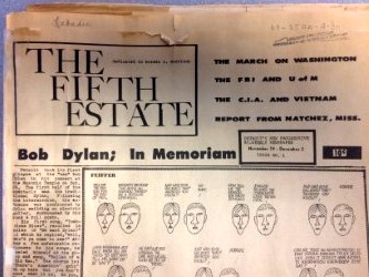 The immediacy of social media led to the concept of a fifth estate, consisting of web-based technologies. Curiously, that was the name of a countercultural underground newspaper, first published in 1965 in Detroit. The first issue included a review of a Bob Dylan concert, a “borrowed” Jules Feiffer cartoon, and announcement of a march in Washington. The periodical remains active and is believed to be the longest-running anarchist publication in English. The Fifth Estate archives are held here at the University of Michigan in the Labadie Collection at the Harlan Hatcher Library. [Below: First page first edition Nov 19-Dec 2, 1965. Courtesy UM Labadie Collection & Julie Herrada]