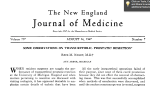 Eighty years ago, this month, the head of the Section of Urology at the University of Michigan in the Department of Surgery published an important paper in the New England Journal of Medicine. This fact is doubly curious because it was a surgical paper in a journal of medicine and Michigan is hardly in New England. That journal, the “journal of record” for historical and contemporary reasons, attracted the most important medical papers internationally, a reputation still largely intact although challenged by other world journals such as The Lancet, British Medical Journal, and the Journal of the American Medical Association. Reed Nesbit’s paper had global significance, as TURP became the gold-standard solution for the common curse of benign prostatic hypertrophy. The surgical procedure was as much art as skill and Nesbit was the go-to TURP artisan of the time, attracting trainees and visitors from around the world. The centennial of urology at the University of Michigan (1920-2020) is approaching and the changes in urology, some emanating from the University of Michigan over those 100 years, are astonishing to consider. More largely, the changes in healthcare itself are enormous, and much of the change is due to massive expansion of the federal role.