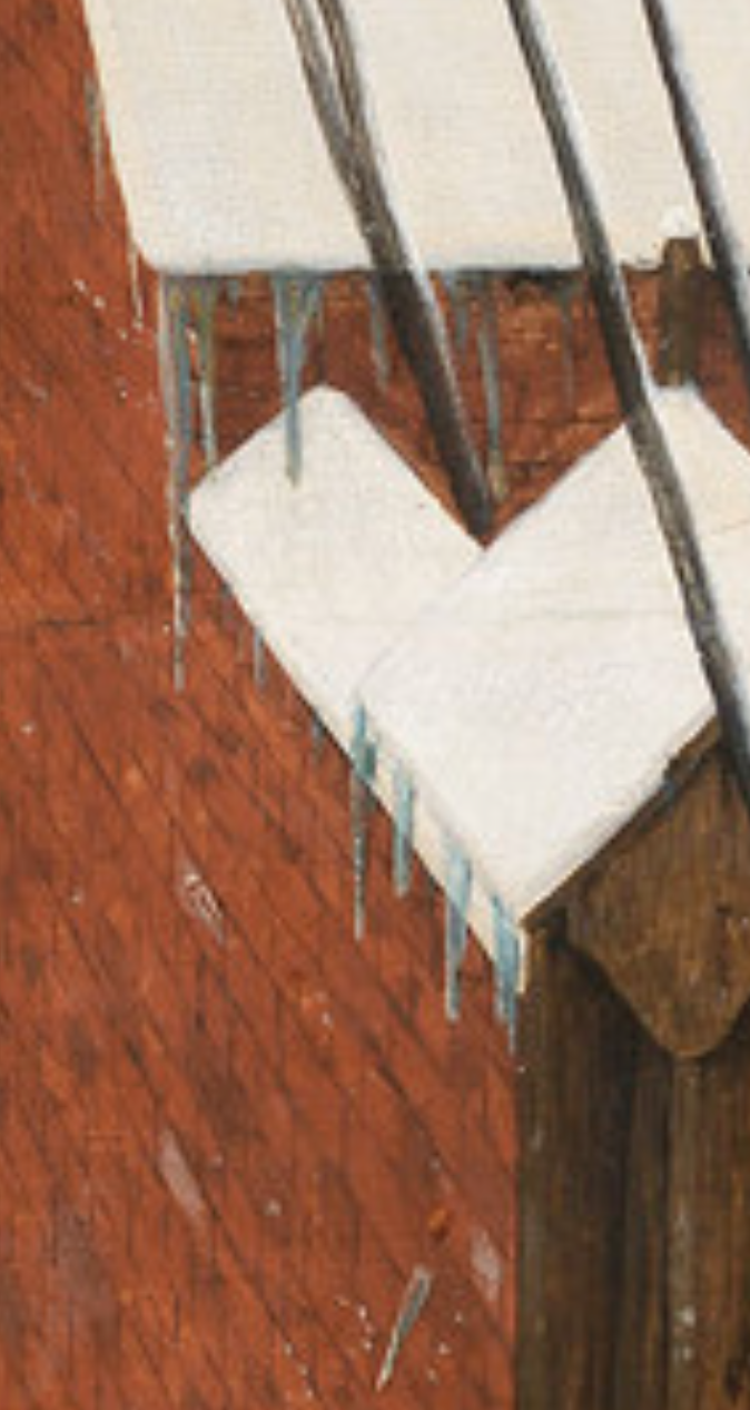 Bruegel’s icicles (above) look charming enough, until you view the grim larger work (below – original at Queens Gallery, British Royal Collection). One broken icicle is falling in response to men kicking in an adjacent door. The actual painting has a complex history of paint-overs transforming it from grisly slaughter of babies to the plundering of a village.