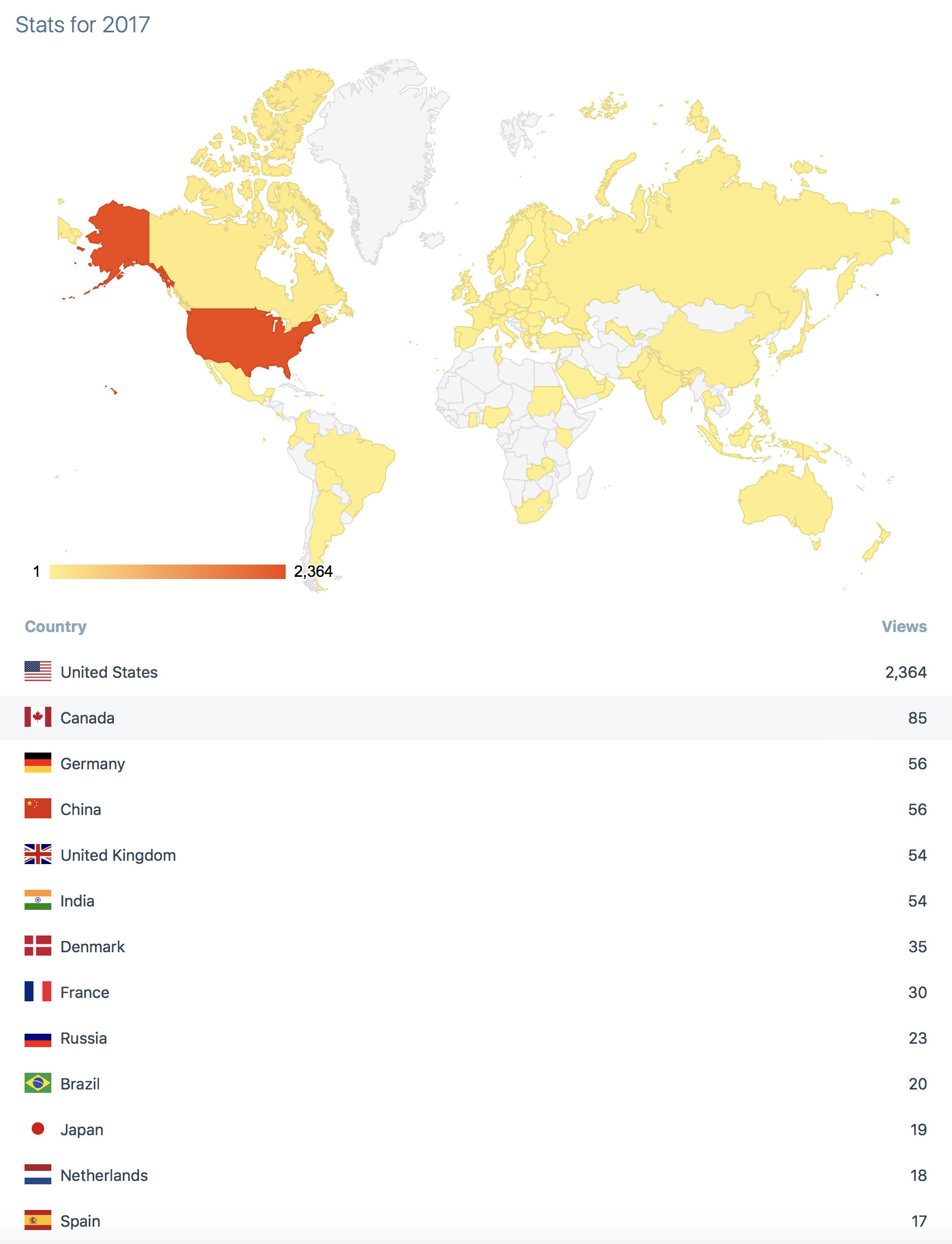 We began a parallel version of What’s New in March, 2013, on a website labelled Matula Thoughts. This version allows us to archive the monthly columns, thereby minimizing duplication and providing the unexpected voyeuristic capability of showing the numbers and distribution of web-version readers. Likely only some of them read this carefully, while most probably glance or sprint through it. Nonetheless, the surprising numbers and distribution are evidence of the internet’s ability to connect the world. [Screenshot below – 2017 statistics page of Matula Thoughts.]