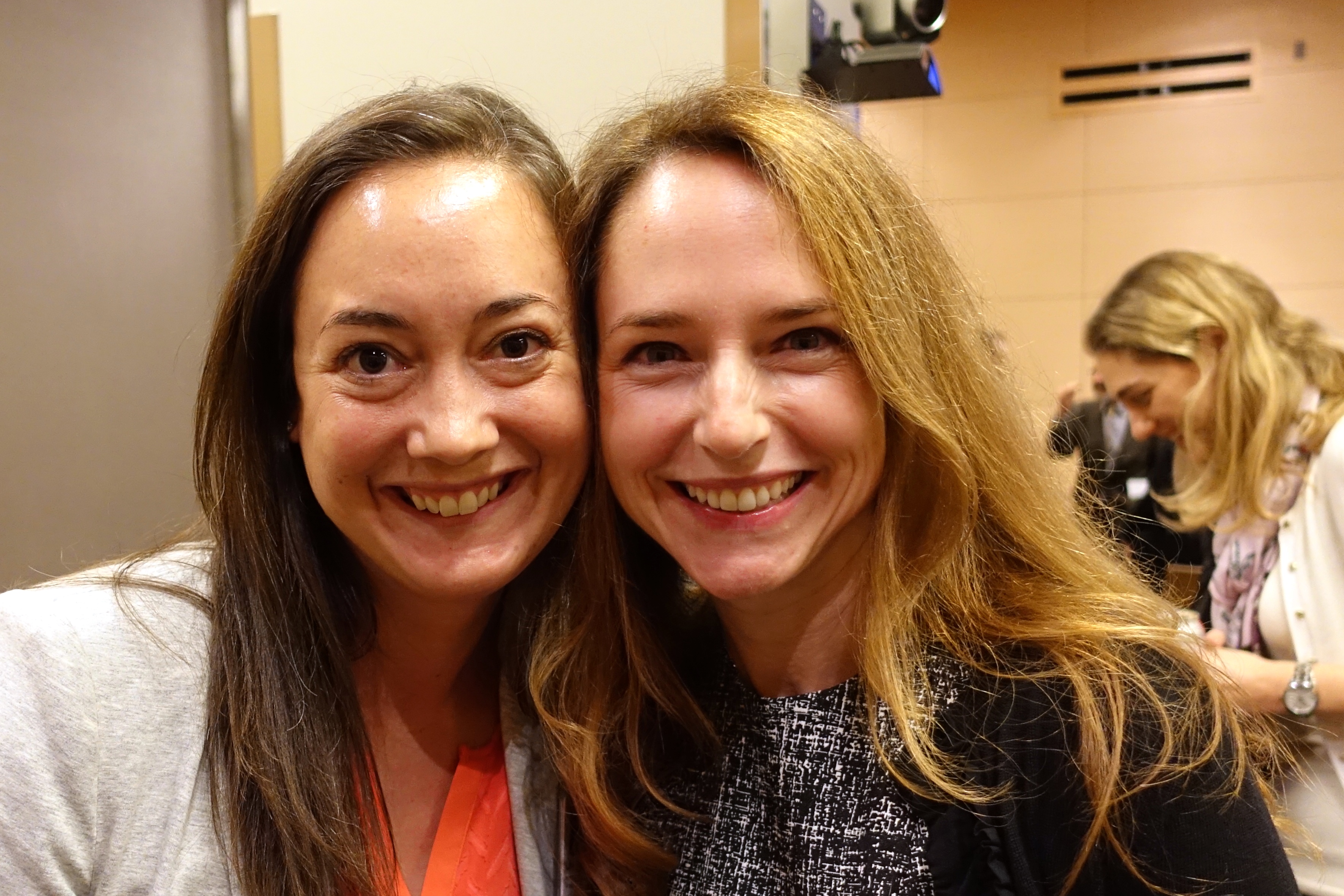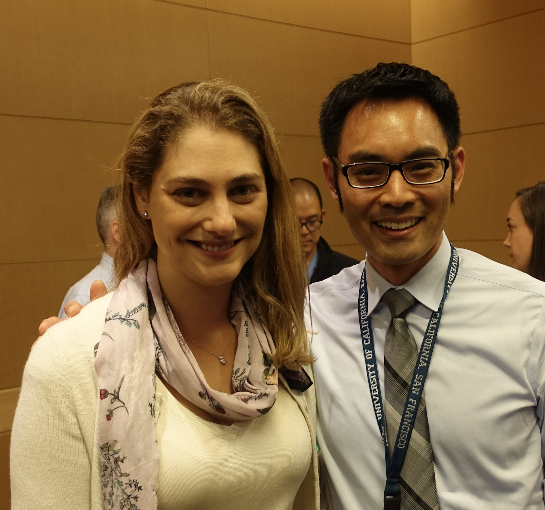 Visiting another peninsula. I was guest at another great public medical school and urology department that recently celebrated its first centennial, the University of California San Francisco. Our two institutions share many features and a number of Michigan medical students, trainees, and former faculty populate UCSF Urology. Unlike Michigan Medicine, UCSF is physically separate from its parent campus, across the Bay at Berkeley. The UCSF teaching hospital was founded in 1907, the year after the San Francisco Earthquake, and was the first university hospital in the University of California System. Schools of Medicine, Nursing, and Pharmacy co-located with the medical school on Mount Sutro along Parnassus Avenue and, like Michigan, the Parnassus Campus outgrew its geographic limits. While we at Michigan expanded to North Campus, East Ann Arbor Medical Campus, and other sites, USCF is also expanding widely, most notably to its grand new Mission Bay Campus. [Above: UCSF teaching conference with residents and an attentive canine named Peanut. Below: UCSF Assistant Professor Lindsay Hampson, UMMS 2009, next to Professor Kirsten Greene.]