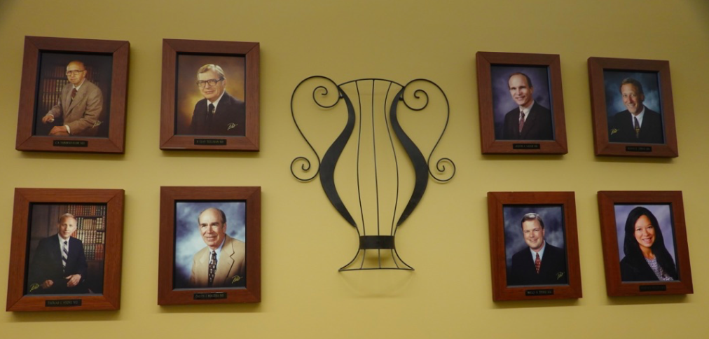 West Shore Urology (WSU) in Muskegon became a part of Michigan Urology only ten months ago and on my visit there last month it was nice to see the Block M logo on the sign in front and on the lab coats of the team. The photos at the front of the clinic show founder Tom Stone and the original partners, along with the current team, although the newest member, Adam Walker, needs to appear on the wall. [Below: clinic wall and Adam & Jaclyn Walker with Malissa Eversole at AUA Nesbit reception, 2018.]