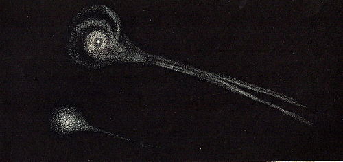 Biela’s comet was zipping around Earth for a long, long time before it was identified and named by human beings. Baron Wilhelm von Biela (1782-1856), a German-Austrian military officer who fought in the Austrian Army in military campaigns against Napoleon, provided the name. An amateur astronomer, Biela had a keen interest in comets and sunspots. His comet, 3D/Biela, was recorded as an object in the sky in 1772 by French astronomer Charles Messier, but it was Biela who, in 1826, recognized it as a comet with periodicity of 6.6 years. It was spotted next by John Herschel on September 24, 1832, and calculations indicated that it would pass through the Earth’s orbit October 29, leading to dire predictions of catastrophic collision. Only two other comets had been recognized as periodic at that time, Halley and Encke. Biela also identified the Great Comet of 1823, as did Nell de Bréauté in Dieppe, France, and Jean-Louis Pons working in Italy. Biela’s Comet didn’t crash into the Earth, but rather started to break up before its 1845 return and by 1852 it came back in two large distinct sections, both identified by Otto Wilhelm von Struve, a family name familiar to urologists. [Above: von Biela. Below: drawing of Comet 3D/Biela in February 1846 after split into 2 pieces. 1888 book by E. Weiss, Bilderatlas der Sternenwelt. Sources, Wikipedia.]