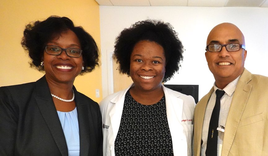 An interview with Chester online from the University of Iowa (May 16, 2017): “If you could change one thing about the practice or business of medicine, what would it be? Equality of opportunity and adequate quality in all the benefits.” [Above: Chet & Sandy, October, 2018, photo courtesy Cheryl Lee. Below: Cheryl, Emefah Loccoh medical student, Rama Jayanthi.]