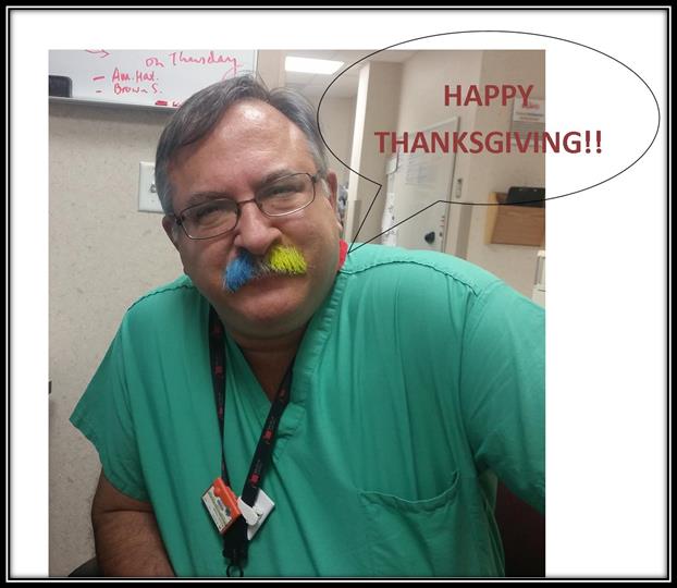 Frank looked more like a curmudgeonly surgeon than a cheerful Thanksgiving pilgrim, although his Michigan moustache in his Ohio State workplace, warmed our hearts.