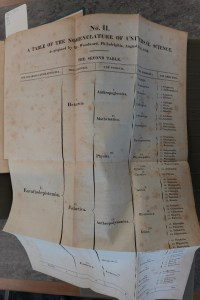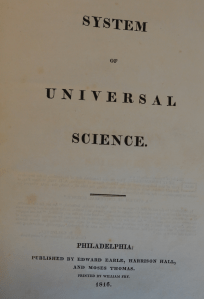 Woodward and Jefferson had very different personalities, but shared deep interest and expertise in education and in natural history, categorized now as science. The two men were early adaptors of the modern term. Woodward’s interests were expressed most inclusively in his 1816 book, A System of Science, that contained the basis for the University of Michigania, as named in 1817, when Michigan was still a territory. Woodward called the medical branch of knowledge Iatrica, listing its various components in on of the two curious fold-out tables at the end of the book. The grandly-named, but meagerly implemented university opened in Detroit in a modest building, but little record remains of the curriculum and students, except that activity was suspended due to cholera epidemics in 1832 and 1834. [Below: title page of Woodward’s book and fold-out table.]