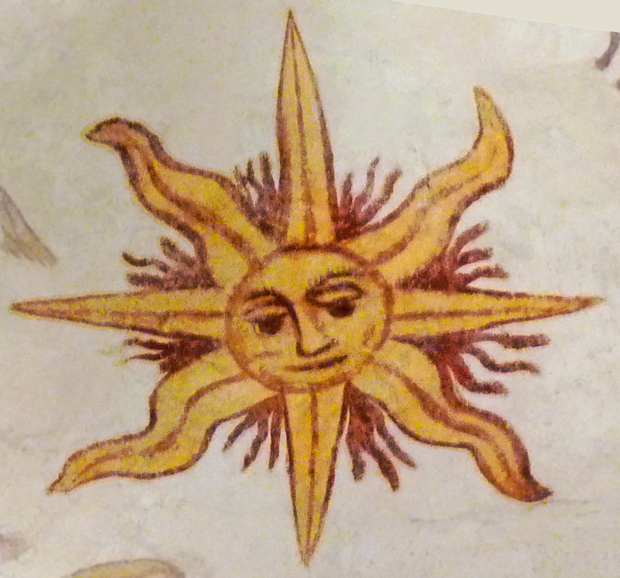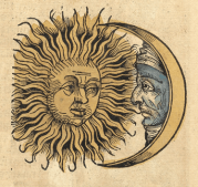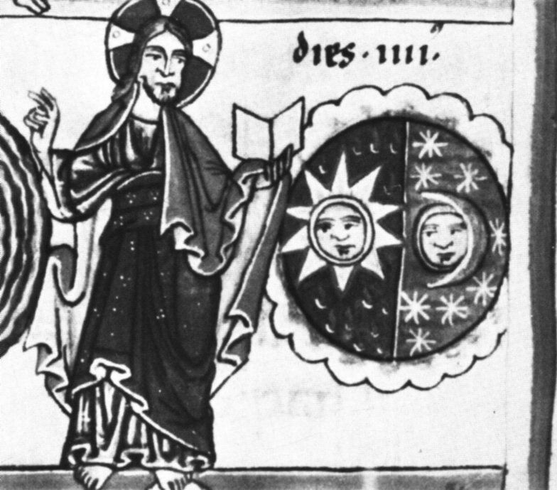 The man-in-the-moon, a whimsical anthropomorphic imagination, when combined with a solar face suggests the ancient Asian complementary opposites yin and yang. [Below top: Amiens, Bibliothèques d’Amiens Métropole, manuscrit Lescalopier (Fourth Day of Creation) c. 1200. Wikipedia. Bottom: yin and yang.]