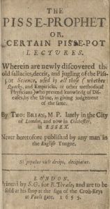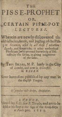 The paradigm shift from uroscopy to urology occurred over two centuries replacing sensory examination of urine by eye, nose, and occasionally tongue, with microscopy and chemical analysis. Nevertheless, persistent uroscopic fortune-tellers claimed legitimacy even in the face of emerging scientific reason. Thomas Brian’s book in 1637, The Pisse Prophet, is a classic example of rational attempts to debunk dogma and fraud.[Below: Wellcome Library, 1655 copy.]