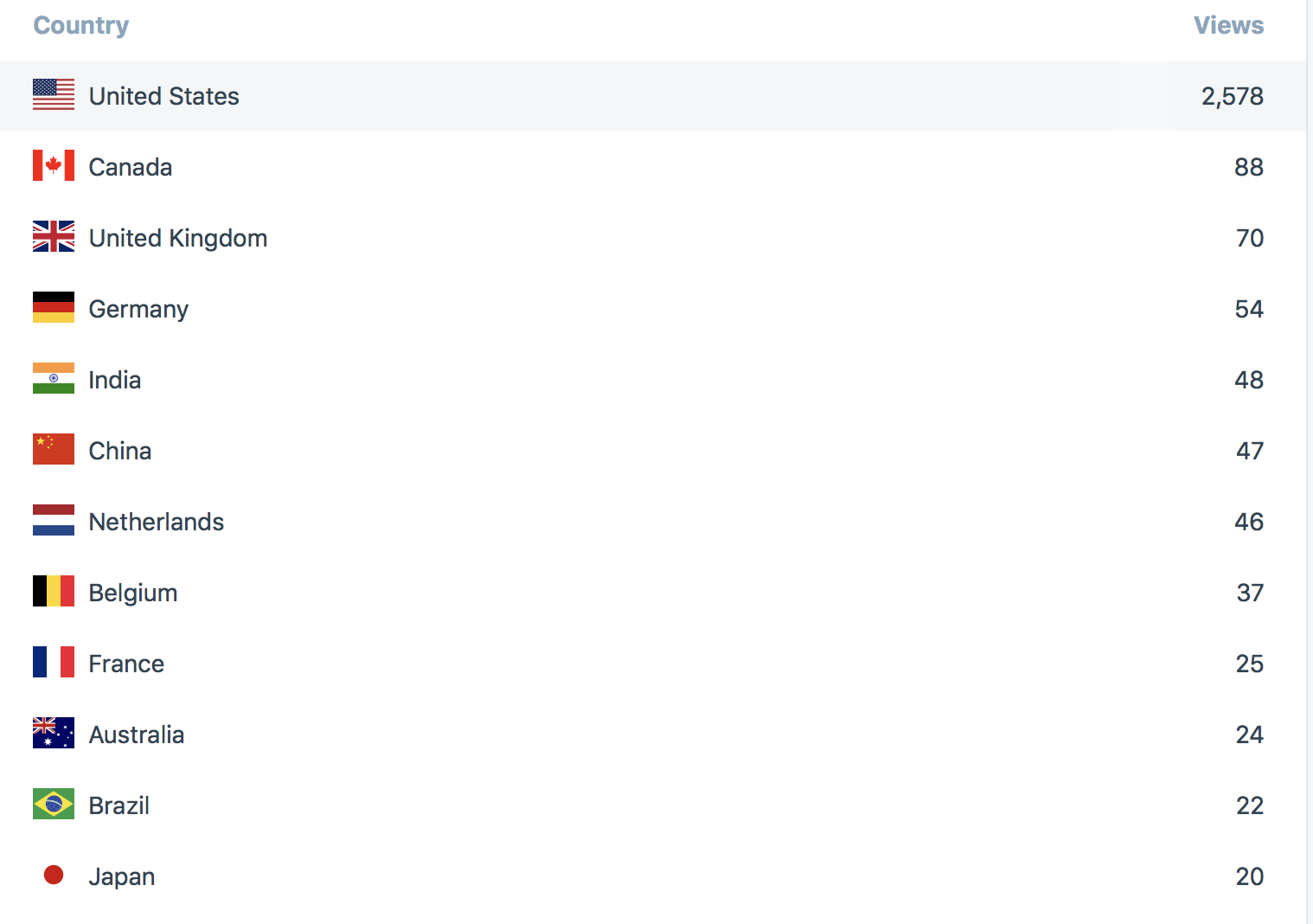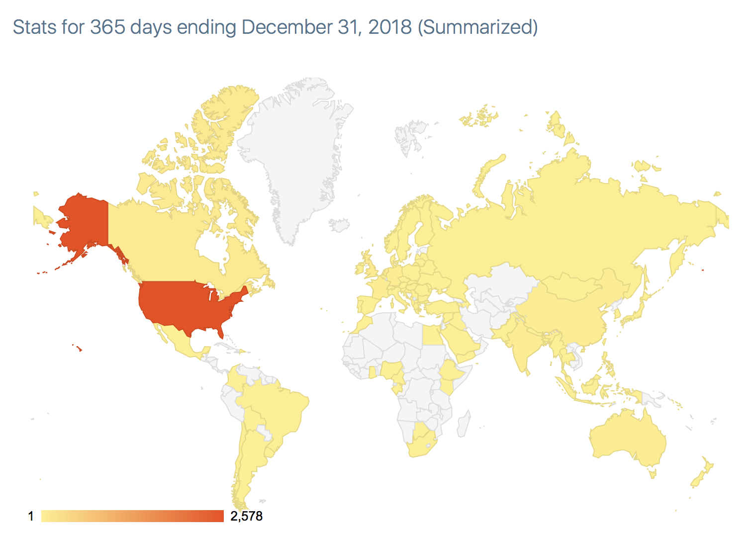 Matula Thoughts analytics, 2018. We have no sense of the readership of the monthly What’s New delivered by email, but the web version, MatulaThoughts.org had 3454 views last year compared 3173 views in 2017. Viewers came from 89 countries, ranging from a few viewers in 35 countries, to 54 in Germany, 70 in the U.K., 87 in Canada, and 2578 in the US. Most views are cursory, but we enjoy hearing back directly from periodic careful readers who challenge our facts and alert us to errors.
