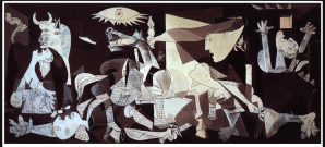 Picasso completed the large oil painting on canvas in June, 1937, after 35 days of work. The specific disputes of the Republicans and Nationalists, and the justifications of their supporters and suppliers are nowhere evident in the mural, only the grotesque mangled forms and anguished expressions of the victims. Guernica may be Picasso’s greatest work and one of mankind’s iconic images of the horror of war. The event itself was miniscule in the grand scale of 20th century conflict, but Picasso made it a transcendent moment for humanity.