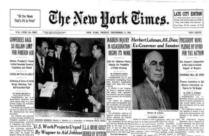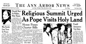 The news cycle, one hundred years ago, centered around the daily papers with a 24-hour rhythmicity. The national news for December 6 contained little information that today’s newshounds would recognize, except perhaps for mention of the Warren Commission in the New York Times, an Oswald reference in the Ann Arbor News, and a Big 10 athletic scholarship limit reported in the Michigan Daily. [Thanks to Katie Baxter for finding these.]