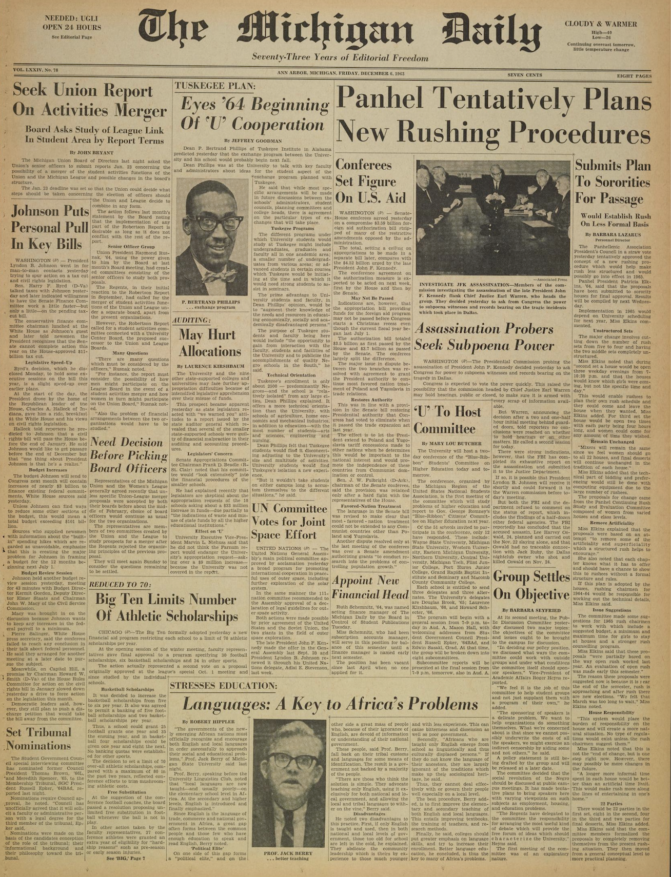 The news cycle, one hundred years ago, centered around the daily papers with a 24-hour rhythmicity. The national news for December 6 contained little information that today’s newshounds would recognize, except perhaps for mention of the Warren Commission in the New York Times, an Oswald reference in the Ann Arbor News, and a Big 10 athletic scholarship limit reported in the Michigan Daily. [Thanks to Katie Baxter for finding these.]