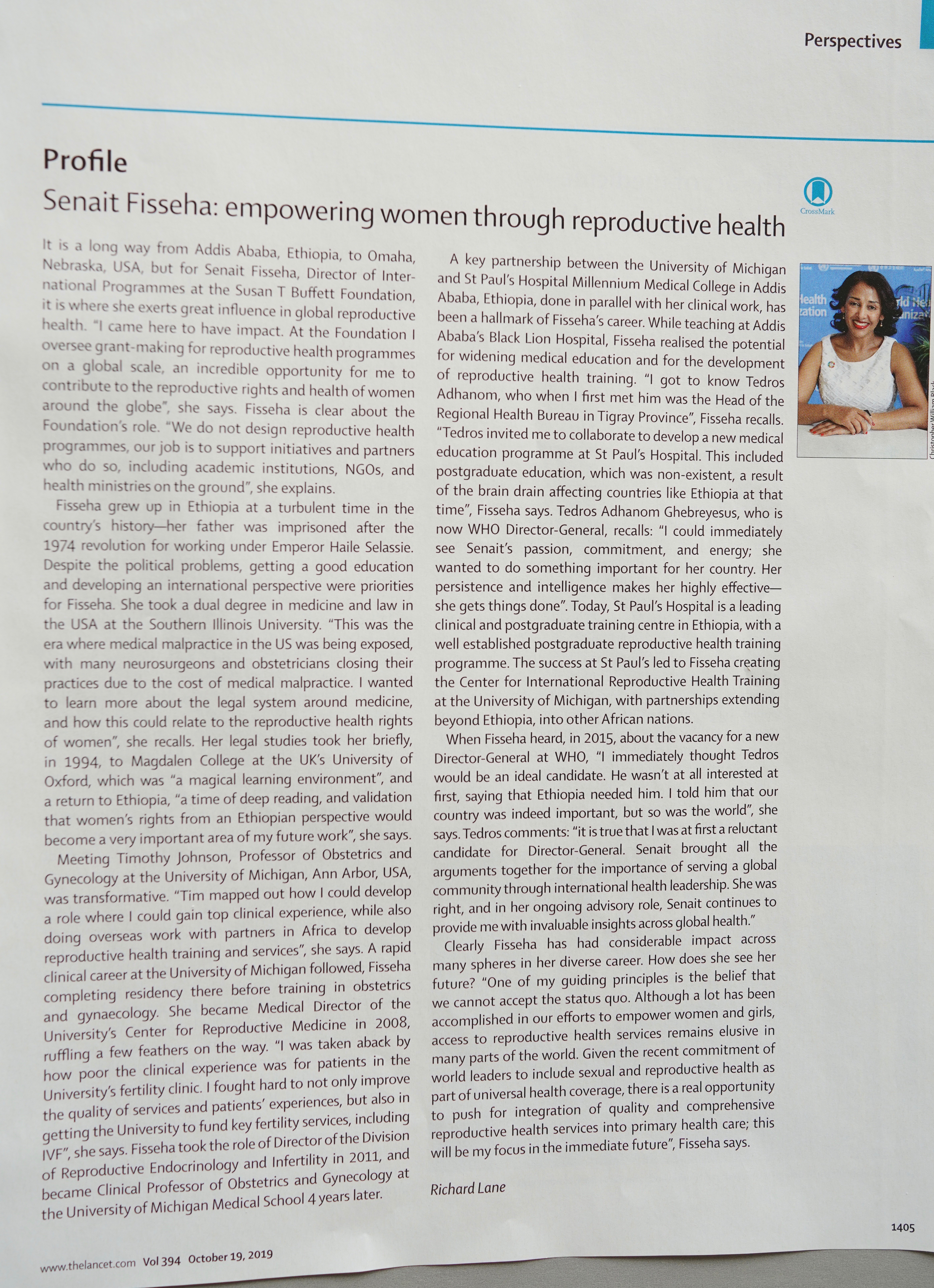 Senait Fisseha. Not every week does The Lancet feature an article on a Michigan faculty member, but that happened recently with a profile on Senait Fisseha, Clinical Professor of Obstetrics and Gynecology. [Lane R. Profile. Senait Fisseha: empowering women through reproductive health.The Lancet. 394:1405, 2019.]  Medical Director of the University Center for Reproductive Medicine in 2008, Director of the Division of Reproductive Endocrinology and Infertility in 2011, and creator of the University of Michigan Center for International Reproductive Health Training, Senait  has developed a partnership between Michigan and St. Paul’s Hospital Millennium Medical College in Addis Ababa, Ethiopia.