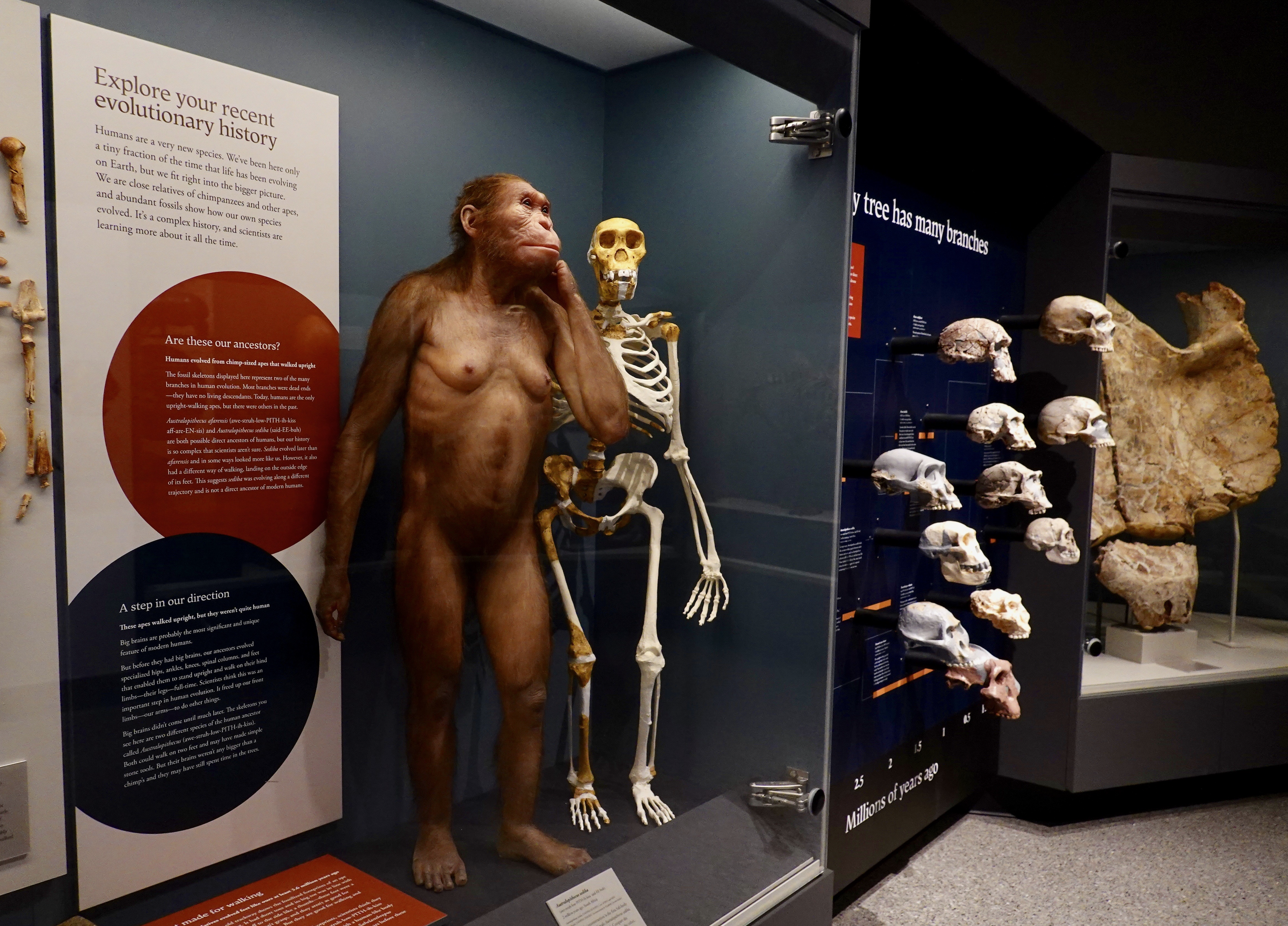 A flat Earth was a reasonable belief for Homo erectus and their other hominin cousins, including Australopithecus sediba shown below in reconstruction at the University of Michigan Natural History Museum (visited just prior to the closure for coronavirus). The campfires, hunting grounds, and cave dwellings of early humans reinforced a sense that their environments were mainly two-dimensional landscapes of hills, valleys, and forests.