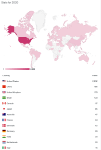 Nothing is beyond the pale on the internet and much of it is measurable. Matula Thoughts took a small dip when the author ceased to be departmental chair of urology at UM in 2019 but readership is back with a rise this year with views at 3458, 3357, and 3929 (31 Dec.) for 2018, 2019, and 2020. This past year 16 countries produced 10 or more “views’ and another 55 countries had “single digit visitors” – enough observers in the cyber forest to justify continuing Matula Thoughts for 2021. Of course, “a view” or “a visitor” is not necessarily a thoughtful reader, but merely a measure of notice within the forest and, happily in terms of forest sustainability, Matula Thoughts doesn’t require many falling trees. Nonetheless, after nearly 20 years of this essay, it remains primarily a “letter-to-self,” if only an affirmation of self that sometimes resonates with someone else. [Below: Word Press readership for Matula Thoughts 2020.]