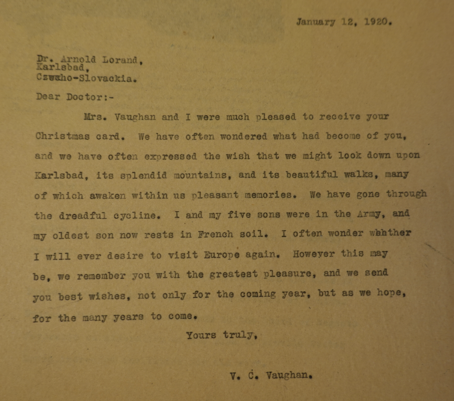 Mrs. Vaughan and I were much pleased to receive your Christmas card. We have often wondered what had become of you, and we have often expressed the wish that we might look down upon Karlsbad, its splendid mountains, and its beautiful walks, many of which awaken in us pleasant memories. We have gone through the dreadful cycline [‘cyclone’], I and my five sons were in the Army, and my oldest son now rests in French soil. I often wonder whether I will ever desire to visit Europe again. However this may be, we remember you with the greatest pleasure, and we send you best wishes, not only for the coming year, but as we hope, for the many years to come. Yours truly, V.C. Vaughan.”